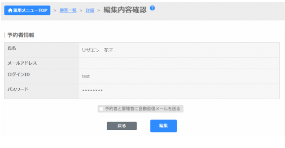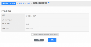 「予約者と管理者に自動返信メールを送る」にチェックを入れてから「編集」すると、メール種別「会員変更」の自動返信メールが送られます。