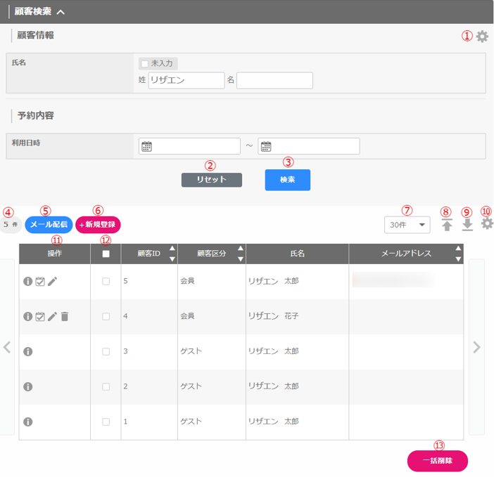 削除:ゲスト⇒削除できません。予約データを削除することで、顧客一覧からも削除されます。