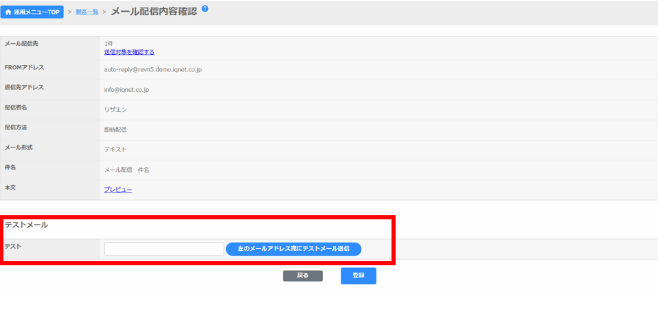 テストメール:メール配信前に確認(テスト)ができます。