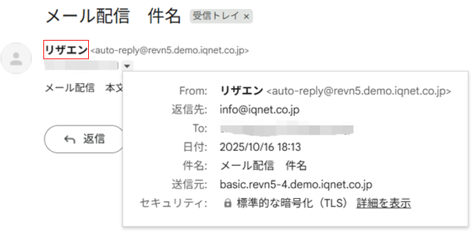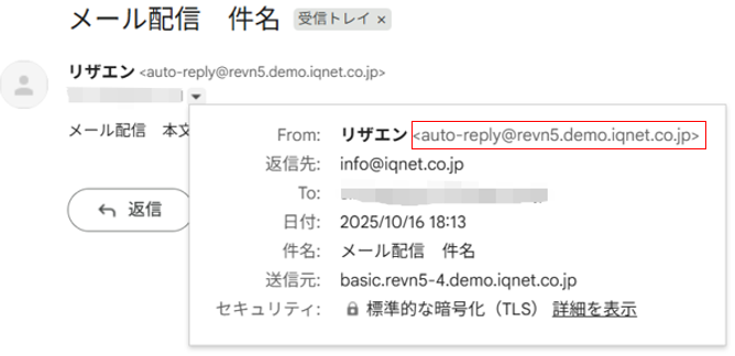 「デモ環境:auto-reply@revn5.demo.iqnet.co.jp」「本番環境:auto-reply@revn.jp」です。
