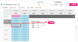 予約枠設定の在庫数を2以上で設定し、かつ確定の予約が入っている枠は、B-①のように表示されます。