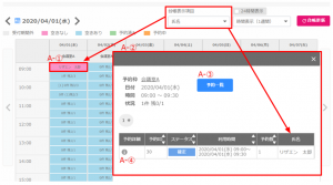 予約枠設定の在庫数を1で設定し、かつ確定の予約が入っている枠は、A-①のように表示されます。