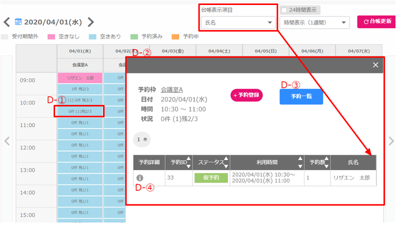 仮予約の予約が入っている枠は、D-①のように表示されます。