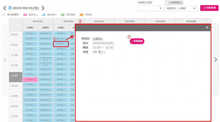 予約したい枠(①)をクリックすると②が表示されるので、新規登録(③)をクリックします。