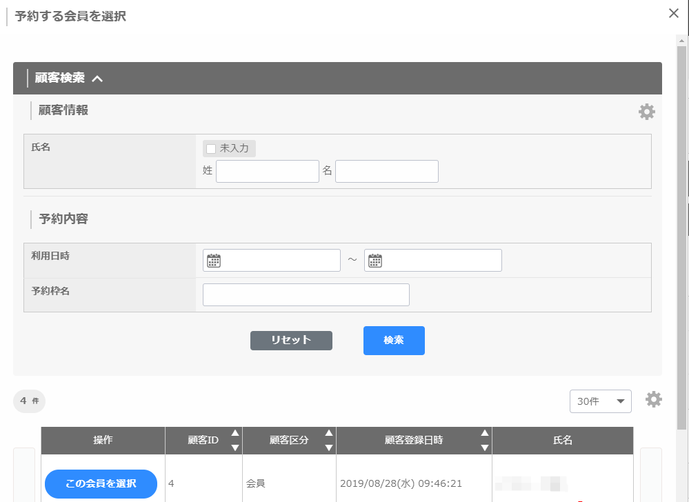 「会員から選択して予約」を選んだ状態で「会員選択」をクリックすると、ポップアップで会員を選択できる画面が表示されます。